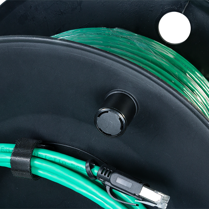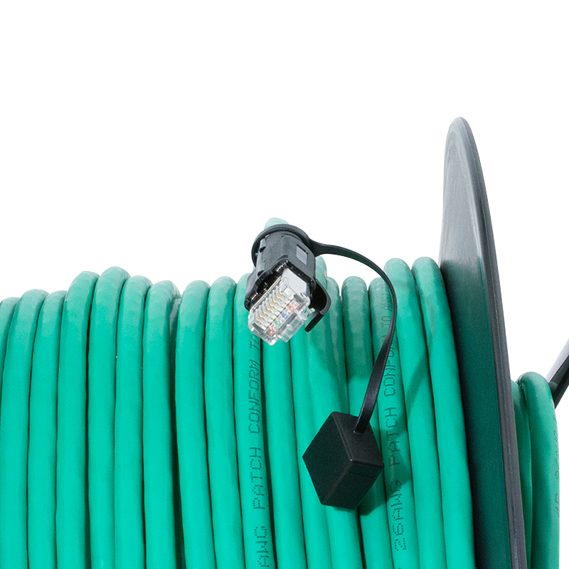 Network cable reel Cat.6A S/FTP 80 m patch cord Link to Datasheet High quality Ethernet network cable on robust cable drum, ideal for mobile use at trade shows, presentations, inspection vehicles, measuring tracks, etc. The cable drum can be used directly on site, no further adapters or patch cables are required. The shielded cable is suitable for data transmissions up to 10 Gigabit Ethernet.